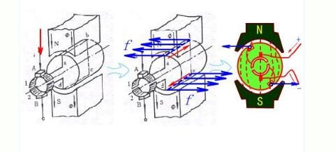 此時載流導體ab和cd受到電磁力的作用方向同樣可由左手定則判定,它們產生的轉矩仍然使得轉子逆時針轉動。這就是微型直流電機的工作原理。外加的電源是直流的,但由于電刷和換向片的作用,在線圈中流過的電流是交流的,其產生的轉矩的方向卻是不變的。
